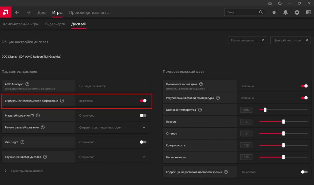 Для геймеров на видеокартах AMD в панели управления Adrenalin существует технология — VSR (Virtual Super Resolution). Принцип ее действия тот же: она добавляет в список разрешений игры варианты, превышающие физическое разрешение монитора. Вам нужно активировать VSR в драйвере, зайти в игру, выбрать самое высокое из предложенных разрешений (например, 1440p для 1080p монитора) и затем для финального масштабирования и реконструкции активировать FSR 2/3 или XeSS, если они есть в игре. Это позволит добиться схожего эффекта повышения детализации и борьбы с размытостью.