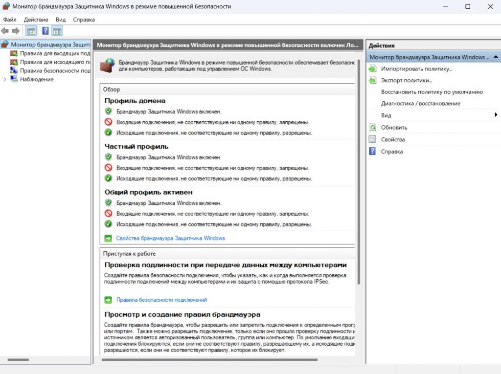 Откроется окно «Брандмауэр Защитника Windows в режиме повышенной безопасности».