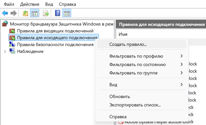 В 95% случаев, когда вы хотите закрыть доступ в интернет, вам нужно блокировать именно исходящие подключения. По умолчанию Windows разрешает всем приложениям выходить в сеть, поэтому нам нужно создать специальное запрещающее правило.