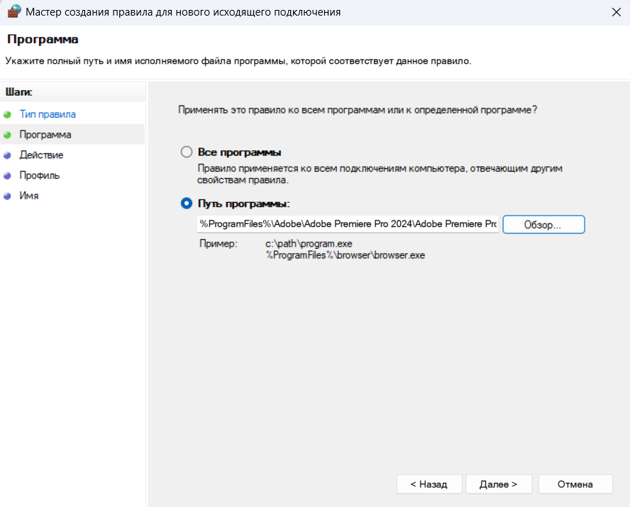 - Путь к программе: выберите пункт «Путь программы» и нажмите «Обзор».