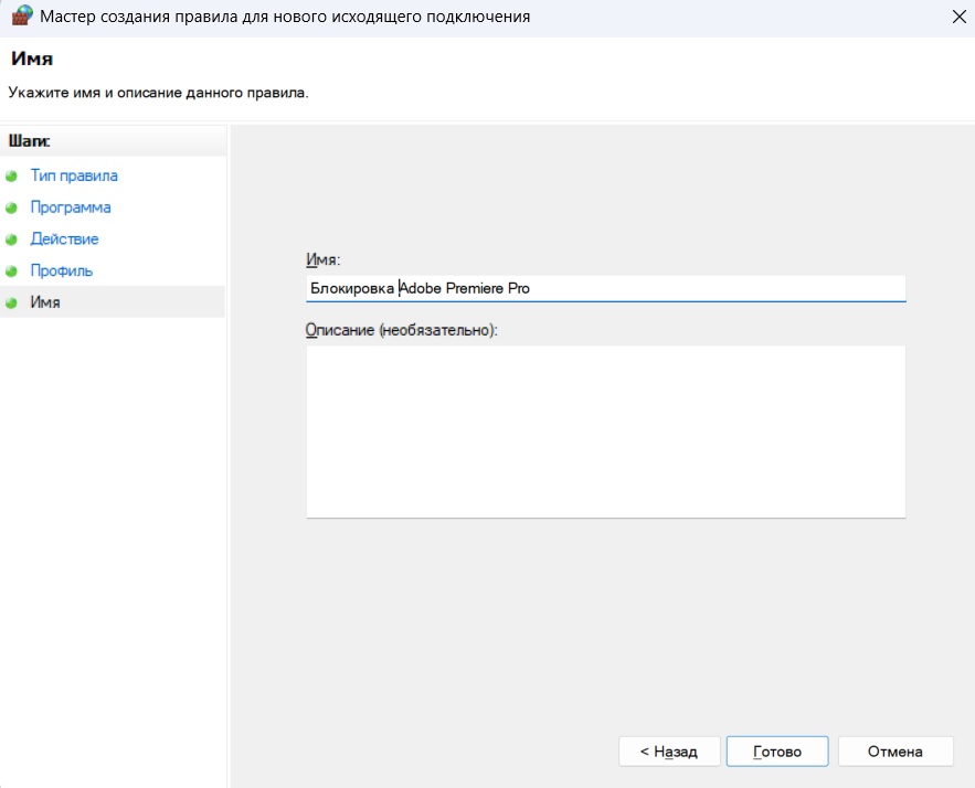 - Имя: Назовите правило так, чтобы через год вспомнить, что это. Например: BLOCK Internet — Photoshop или Запрет сети — Калькулятор. Описание можно не заполнять.