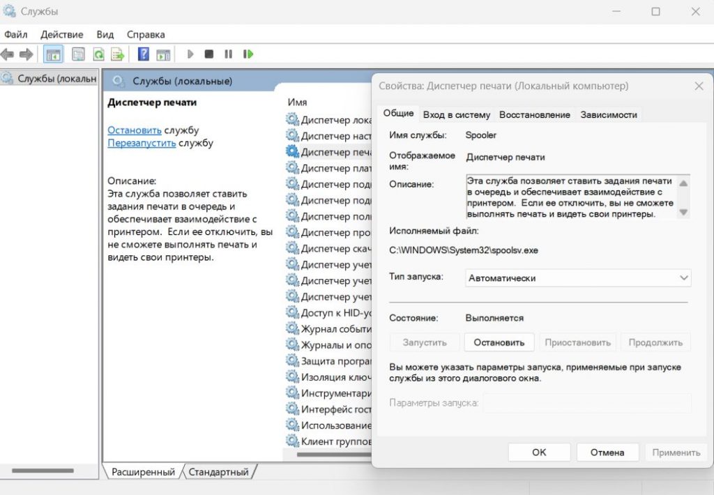 Чтобы проверить состояние этой службы, нажмите Win + R, введите services.msc и найдите в списке «Диспетчер печати». В идеальном сценарии состояние службы должно быть «Работает» или «Выполняется», а тип запуска — «Автоматически».