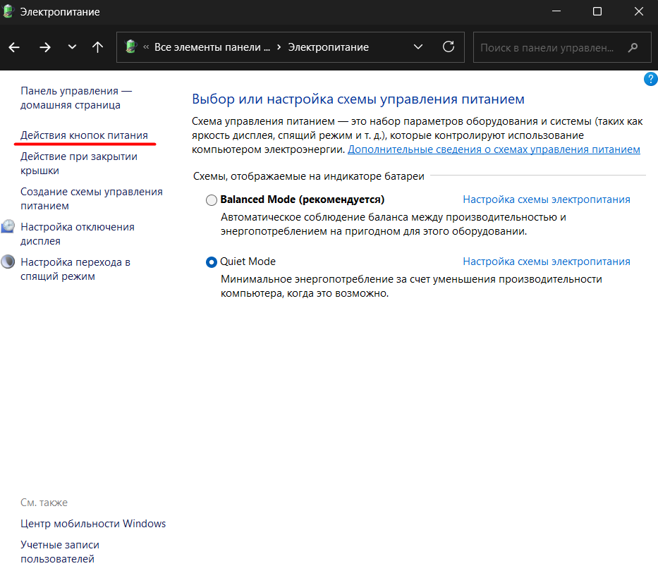 Чтобы проверить этот вариант, нужно зайти в «Панель управления», выбрать раздел «Система и безопасность», а затем перейти в «Электропитание». Там в левом меню выберите пункт «Действие кнопок питания».