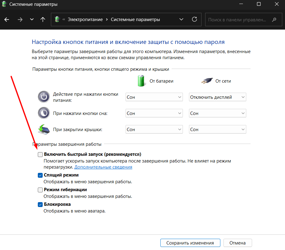 Нажмите на ссылку «Изменение параметров, которые сейчас недоступны» и снимите галочку с пункта «Включить быстрый запуск». После сохранения изменений ноутбук или компьютер должен начать выключаться полностью, что часто решает проблему самопроизвольных запусков.