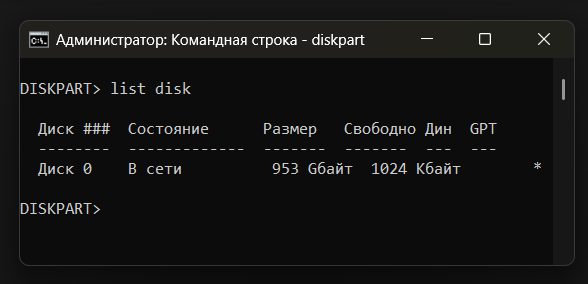 Использование командной строки Diskpart